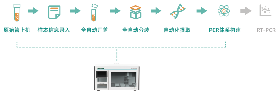 全程自动化完成原始管的信息录入,开关盖,移液和核酸提取,实现样本进,核酸出的自动化过程。