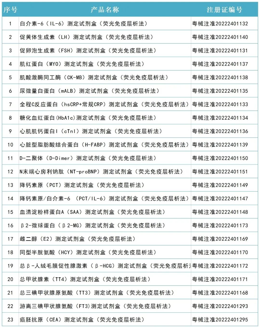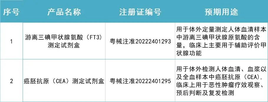 Topay系统(中国)基因下属全资子公司中山生物工程有限公司,2项产品于2022年9月2日又获广东省药品监督管理局颁发的《医疗器械注册证》。分别是游离三碘甲状腺氨酸(FT3)测定试剂盒(荧光免疫层析法)、癌胚抗原(CEA)测定试剂盒(荧光免疫层析法)。
